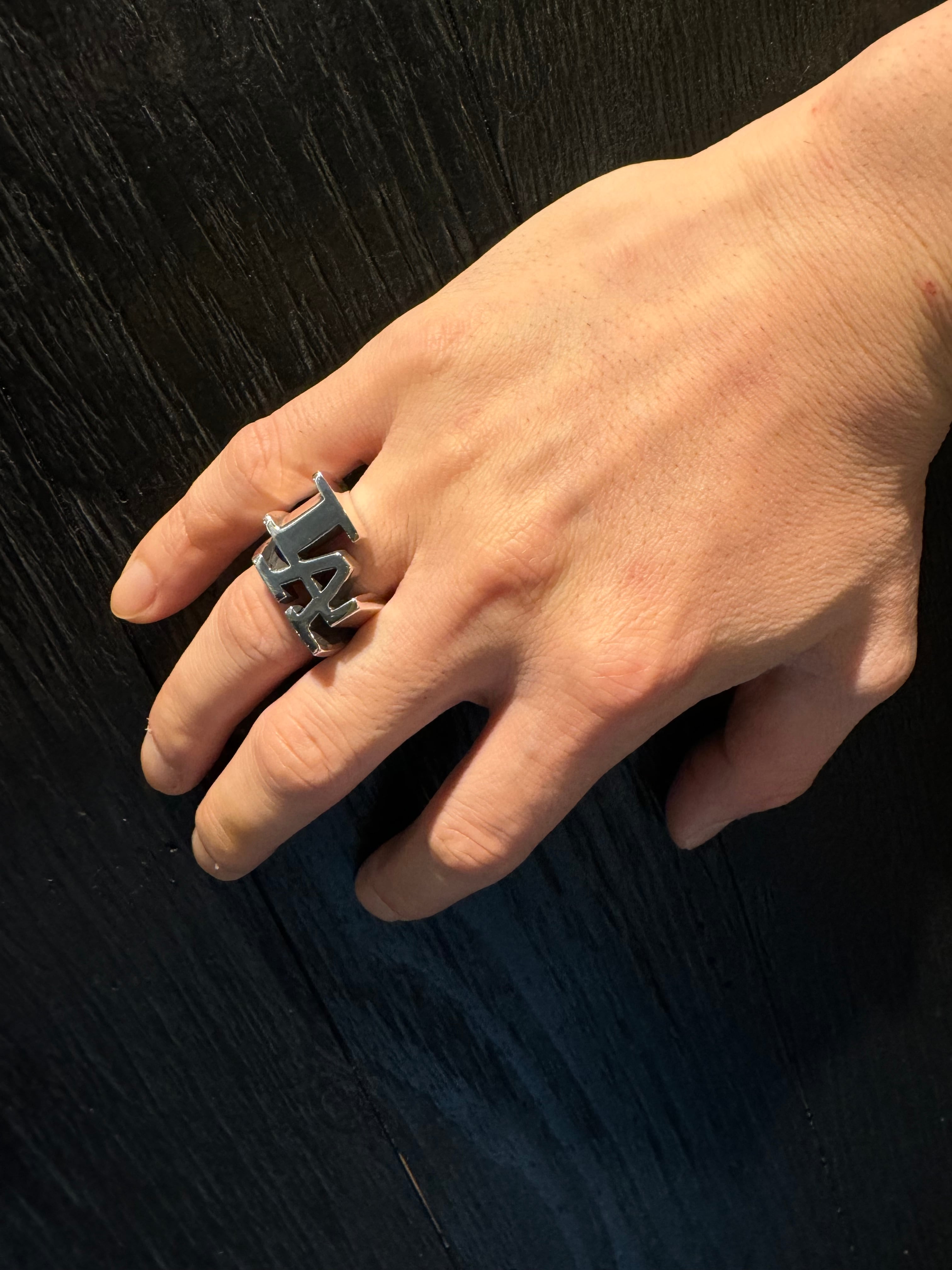 文字を立体的に浮き上がらせたヘビーウェイトなリング。
